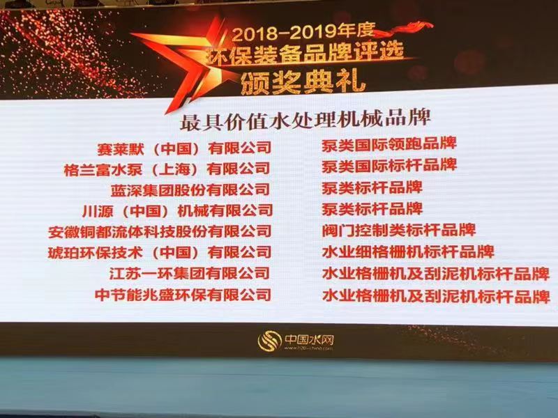 2019年8月17日,在上海舉辦的“2019(第十一屆)上海水業(yè)熱點論壇”暨“2018-2019年度價值環(huán)保裝備品牌”評選中,安徽銅都流體科技股份有限公司再次榮獲“2018-2019年度價值水處理機械品牌”。
