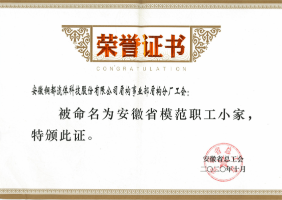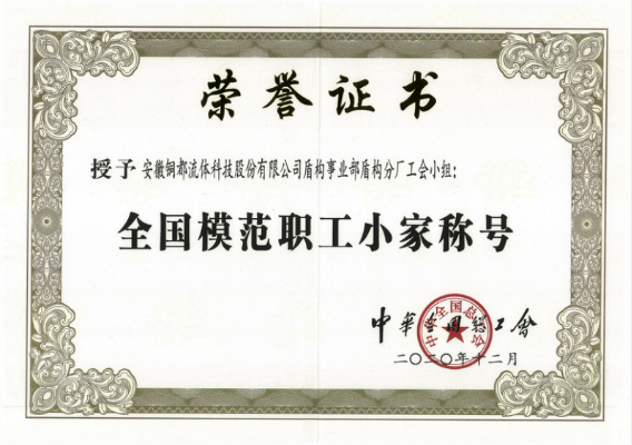 近日,安徽銅都流體科技股份有限公司盾構事業(yè)部盾構分廠工會小組憑借出色的工作榮獲由中華全國總工會頒發(fā)的2020年“全國模范職工小家”榮譽稱號,同時被安徽省總工會評選“安徽省模范職工小家”榮譽稱號。