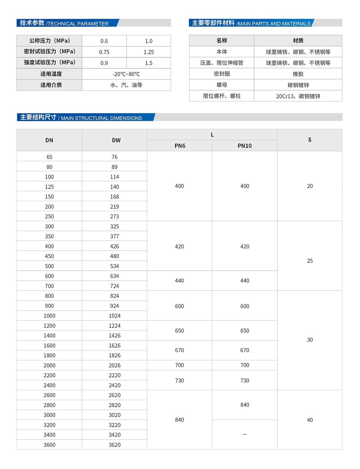 雙法蘭傳力接頭:由本體,密封圈,壓蓋,伸縮短管等主要部件組成。該產品適用于兩邊均為法蘭連接的管道中,安裝時調節(jié)產品兩端的法蘭的安裝長度,對角均勻擰緊壓蓋螺栓,使其成為一個整體,并有一定的調節(jié)量,方便安裝維修時,根據(jù)現(xiàn)場尺寸進行調整。在工作時可以反軸向推力傳遞至整個管道。雙法蘭傳力接頭是由法蘭松套伸縮接頭和短管法蘭,傳力螺桿等構件組成,能降低被連接件的壓力推力(盲板力)和補償管路安裝誤差。雙法蘭傳力接主要用于泵、閥門等附件的松套連接。