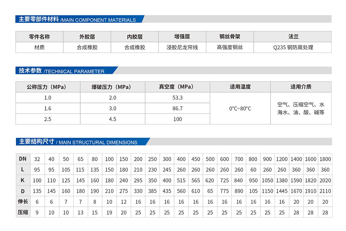 由織物增強的橡膠件,一般由內(nèi)膠層、織物增強層、鋼絲圈、外膠層經(jīng)硫化成橡膠件后與松套金屬法蘭組成,用于管道隔振降噪、補償位移的接頭。可補償軸向位移、徑向位移和角向位移。具有耐壓高、彈性好、位移量大、平衡管道偏差、吸收振動、降低噪音效果好。